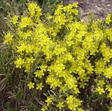 This species is a small shrub growing up to about 8 inches tall. The leaves are tiny, scale-like, and coated in woolly hairs. The yellow flowers have five petals and measure about a quarter inch wide. The plant flowers from May to July.[3]