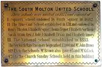 In 1877 it was amalgamated with the Blue Coat School, founded in 1711, and with the National School, founded in 1833. The combined school was known as South Molton United Schools.[20] A 19th century memorial brass tablet situated above the fireplace in the school-hall of South Molton Primary School, North Street, is inscribed as follows: