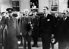 ![]() Sir Hughe Knatchbull-Hugessen (second from left), while British Ambassador to Turkey, next to Anthony Eden in April 1941. | |