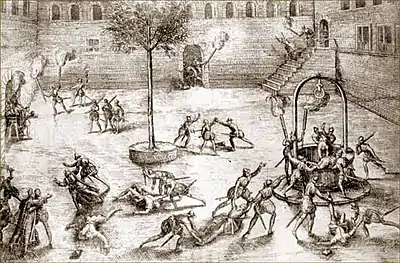 The Catholic Church in France and many of its members opposed the Huguenots. Some Huguenot preachers and congregants were attacked as they attempted to meet for worship.[32] The height of this persecution was the St. Bartholomew's Day massacre in August, 1572, when 5,000 to 30,000 were killed, although there were also underlying political reasons for this as well, as some of the Huguenots were nobles trying to establish separate centres of power in southern France. Retaliating against the French Catholics, the Huguenots had their own militia.[33]