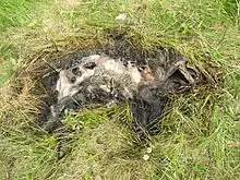 Burial retards the rate of decomposition, in part because even a few inches of soil covering the corpse will prevent blowflies from laying their eggs on the corpse. The depth of burial will influence the rate of decomposition as it will deter decomposers such as scavengers and insects.[2] This will also lower the available oxygen and impede decomposition as it will limit the function of microorganisms.[12] The pH of the soil will also have an effect on the rate of decomposition as it influences the types of decomposers.[13] Moisture in soil will also slow down decomposition as it facilitates anaerobic metabolism.[11]