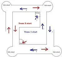 Hurray involves two teams with an undetermined but equal number of players, located in field one and field two. The goal is for each team to get out of their field, through the corridor, outside their field, enter the other team's field by passing through the corridor and step on the triangle, situated on the far corner of the field, shouting "Hurrah".