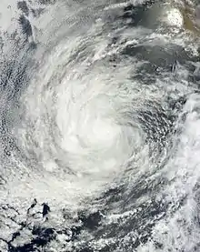 Tracking west-northwestward around the southwestern periphery of a mid-level ridge over central Mexico,[9] Cosme became better organized on June 24. A large area of very cold cloud-tops developed over and just southeast of the center of the storm, and convective banding wrapping into the mass began to form, mainly in the north and east semicircles.[10] Though the cloud pattern became elongated north to south during the pre-dawn hours of the following day,[11] a rapid improvement of the inner core on microwave and the structure on satellite imagery became apparent. A timely AMSU pass indicated an eyewall nearly closed with an accompanying intensity estimate of 77 mph (124 km/h), and a transient eye became visible on early morning satellite images. As a result, the National Hurricane Center upgraded Cosme to a Category 1 hurricane on the Saffir–Simpson hurricane wind scale on June 25.[12] Given the light wind shear, warm sea surface temperature, and moist air environment, the agency predicted further intensification for the following hours.[13] Around 00:00 UTC on June 26, Cosme attained its peak intensity with maximum sustained winds of 85 mph (140 km/h) and a minimum barometric pressure of 980 mbar (hPa; 28.94 inHg).[2] Thereafter, a decrease in sea surface temperatures caused convection on the west side of the circulation center began to erode significantly.[14] Late on June 26, the system weakened to a tropical storm.[2] The tropical storm wind radii expanded early the following day, but the inner core of Cosme, specifically the structure of the eye, began to degrade; the low-level circulation became decoupled with the upper-level circulation as well, and all thunderstorm activity dissipated.[15] Reduced to a swirl of low to mid-level clouds, winds decreased below tropical storm-force and deep convection did not reform over the center.[16] At approximately 12:00 UTC on June 27, Cosme degenerated into a remnant low pressure area while situated about 690 mi (1,110 km) west-southwest of Cabo San Lucas, Baja California Sur. The remnant low of Cosme continued northwestward for the next several days, before degenerating into an open trough on July 1 about 1,610 mi (2,590 km) east-southeast of the Hawaiian Islands.[2]