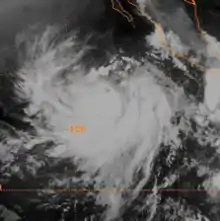The seventh tropical cyclone of the season originated from a tropical depression that developed during the afternoon hours of July 23 about 200 mi (320 km) north of Clipperton Island. Due to light wind shear and warm ocean temperatures, the Eastern Pacific Hurricane Center (EPHC) upgraded the depression to Tropical Storm Gil at 0000 UTC on July 24.[1] Gil was briefly expected to re-curve and approach Baja California Sur, but this never materialized.[2] Gil subsequently began to intensify; on 0000 UTC July 25, the EPHC reported that Gil had intensified into a strong tropical storm, with winds of 70 mph (115 km/h). Roughly 24 hours later, the storm was upgraded into a Category 1 hurricane on the Saffir-Simpson hurricane wind scale. Early on July 27, the storm attained its peak intensity of 90 mph (145 km/h). Despite turning west-northwest, Hurricane Gil maintained hurricane intensity until 1200 UTC July 29 when the storm began to encounter cooler waters. By 0000 UTC July 31, Gil was downgraded a tropical depression.[1]