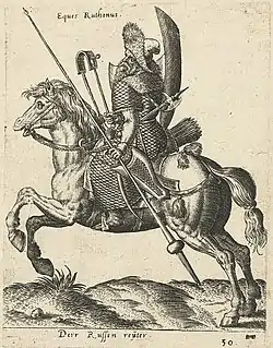 Russian hussars, led in 1654 by Colonel Christopher Rylsky, wore wings.[8] The Armoury has preserved Russian hussar armour of the 17th century. Russian hussars could also be supplied with Reitar Armour. So, for example, Prince Khovansky did in 1661, when he did not have time to receive the hussar armour. As the prince wrote: "I have accepted 360 plates in the regiment. Of this number, 91 plates were given to the hussar, while by your (royal) decree, hussar armor will be sent to me, and the remaining 269 plates were given to the regiment of Colonel Davyd Zybin to the reitars... And hussar armor and shishaks did not come to my regiment in July until the 7th, and a hussar cannot be without armor and shishaks and without handcuffs".[9]