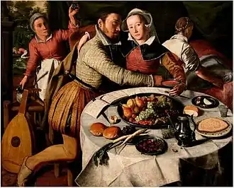 His Prodigal son feasting with harlots is not only a kitchen style scene but also falls in the category of the 'loose company' or 'merry company' painting genre developed earlier in the century by Jan Sanders van Hemessen. Beuckeleer depicts the subject in the form of a rendezvous between an elegantly dressed young couple sitting at a table. On the table a lavish still life is displayed, adding to the impression of upscale taste. The elegant man has clearly started his wooing earlier by playing the lute at his side. However, the actions of the servants makes clear that the true nature of the setting is that of a brothel rather than that of an upscale dwelling. Like Jan Sanders van Hemessen did in his earlier treatment of this subject, Beuckeleer included in his picture another scene from the biblical story of the prodigal son: in the background on the left the prodigal son is seen eating pig swill after he has squandered his inheritance and fallen on hard times.[14]
