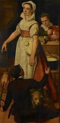 The market and kitchen scenes showing the lavish produce available in Antwerp at the time have often been interpreted as showcasing the prosperity of Antwerp, the then most important trading port in the Netherlands.[15] Others see the compositions as satirical and bearing a moralistic intention.[16] Some commentators have pointed to the erotic tension between the various actors in the scenes. For instance, the composition The kitchen maid and her helpers shows a cook standing in front of a fireplace, while she holds a big cabbage under her left arm and her right hand points to a chicken on a spit. A kitchen boy sitting at her feet on a bench with a dog on his lap is turning the spit. With his right hand he points to a young kitchen helper behind the kitchen maid. This young helper is placing a pot on a kitchen counter and is returning the boy's gaze. The kitchen interior is unmistakably dominated by erotic tension between the kitchen boy and the older kitchen maid. The big dog in the lap of the kitchen boy refers to his sexual desire while various comical and farcical foods, such as the rotisserie chicken, the cauldron of porridge, the cucumbers and the large cabbage under the arm of the kitchen maid indicate that she is available. In The egg seller another popular theme of Flemish genre art is depicted: that of the unequal love between an older man and a younger woman.[17]