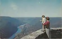 Hyner View State Park is 5 miles (8 km) from Hyner Run State Park and is administered from there. The lookout area is bordered by a large stone wall that was built by the Civilian Conservation Corps during the Great Depression.[2] The current access road from Hyner Run State park was built in 1949 (it also connects to a dirt road that leads to Pennsylvania Route 44). After the new access road opened, the first Flaming Fall Foliage Festival was held at the park. It has since outgrown the park and is currently held in nearby Renovo. The park was officially transferred to the Bureau of State Parks in 1965.[1]