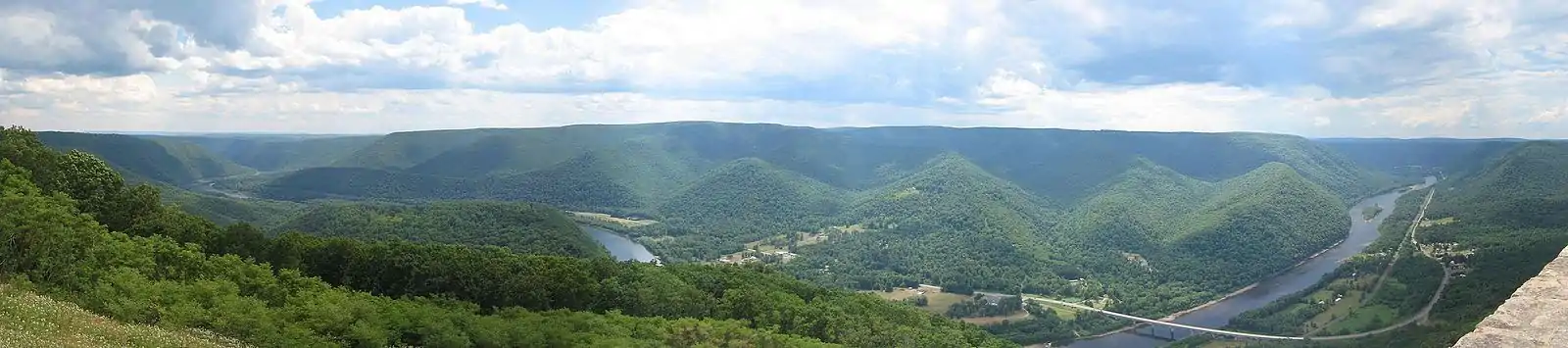 ![]() View of the West Branch Susquehanna River valley, with Pennsylvania State Route 120 (the Bucktail Trail) crossing it, looking west-northwest from Hyner View State Park | |