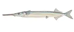 The garfish is an unusual looking fish with many distinct features such as its elongated slender body, as well as its long lower jaw. The garfish typically grows to about 22 centimeters.[2] The colouring of the fish allows it to appear somewhat camouflaged due to it having a greenish blue upper body with brown flecks and a silver-white belly and underbody.[3][4] According to Montgomery and Saunders, "the fish can control its coloration by expanding or reducing the pigment in the dorsal melanophores".[5] They also have a long silver strip running from the top of the pectoral fin base to the tail.[3]