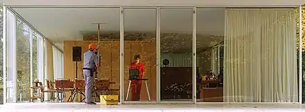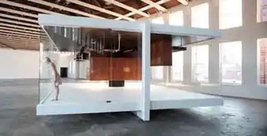In several projects, Manglano-Ovalle investigated intersections of cultural systems, such as modernism, with politics, science, and nature. The video-installation trilogy Le Baiser/The Kiss (1999), Climate (2000) and In Ordinary Time (2001)—all set in Mies van der Rohe buildings—and Always After (The Glass House) (2006) engage the beauty, ambitions and failings of modernism as well as interrelated environmental, geopolitical, class and social issues;[45][7][27][14] New York Times critic Ken Johnson called them "sleek and suspenseful video installations that meditate on modern technocracy."[25] Manglano-Ovalle revisited these themes in a Whitney Museum show he designed ("Mies in America," 2001) and Gravity Is a Force To Be Reckoned With (MASS MoCA, 2009), in which he reconstructed van der Rohe’s never-built House with Four Columns (1951)—a square, open- walled glass structure—at half scale (25 x 25 feet) and inverted, with its furniture and partition walls installed upside down from the ceiling (the original's home's floor).[46][47][22]