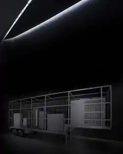 Three large-scale works employing technical processes of data gathering, modeling and fabrication connect science and political power. Cloud Prototype No. 1 (2003) used atmospheric data to create a gargantuan, amorphous titanium-alloy and fiberglass sculpture capturing the fleeting form of a thundercloud;[49][50][25] its frozen quality and resemblance to a nuclear blast cloud evoke liminal, transformative moments between benign and perilous, progress and destruction.[27][4][41] Phantom Truck (Documenta 12, 2007) was a physical realization of the biological weapons lab described (but never validated) in Colin Powell's 2003 United Nations speech leading up to the U.S. invasion of Iraq.[13][51] Manglano-Ovalle built the vaguely industrial, container-like structure using computer renderings based on satellite images, State Department renderings and descriptions in Powell's speech.[2][50][13] Displayed in a darkened gallery, the barely visible form was described by curator Elizabeth Armstrong as evoking the shadowy political camouflage that inspired it—"a chilling encounter with a fabrication of a falsehood."[2] Prototype for Re-Entry (2015) is an enlarged (36-foot) version of Brancusi's iconic Bird in Space sculpture suspended in flight that was commissioned for a U.S. Food and Drug Administration building that was once the site of a post-World War II weapons laboratory.[52][40] It uses the site's historical role and the aesthetics of Brancusi's work as points of departure to investigate the parallel searches of modern art and science/weapons development for perfection;[52][40] the project included a (successful) aerodynamics test of a reproduction of the sculpture in the site's still-active hypervelocity wind tunnel.[40][52]
