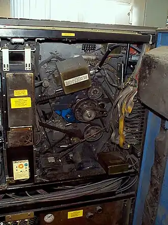 It physically resembles two IBM 1419 reader/sorters connected end to end. Only the right hand 1419 has a running board (used to hold trays of documents to be sorted) while the feed hopper of the left hand 1419 is covered by two doors.[40][41][42] While it physically has 26 pockets, second hand resellers reported it as having 25.[43][44]