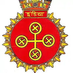 The crest of INS India consists of a swastika with each of its arms ending in a circle enclosing a smaller swastika. The motif is taken from the ancient coins of Ujjain and represents well-being and good relationship. It also represents the spirit of India and her international outlook.[10]