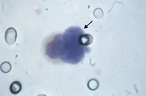 |  A circulating tumor cell (arrow) diagnosed by the ISET test. (The pores of the filter are also visible.) | |