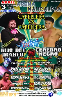 The IWRG Cabellera vs. Cabellera (April 2016) show (Spanish for "hair versus hair") was a professional wrestling supercard event produced by Mexican professional wrestling promotion International Wrestling Revolution Group (IWRG), and took place on April 3, 2016 in Arena Naucalpan, Naucalpan, State of Mexico, Mexico. The focal point of the Caballera vs. Caballera series of shows is one or more traditional Lucha de Apuestas, or "Bet matches", where all competitors in the match risk their hair on the outcome of the match. The Lucha de Apuestas is considered the most prestigious match type in lucha libre, especially when a wrestlers mask is on the line, but the "hair vs. hair" stipulation is held in almost as high regard.