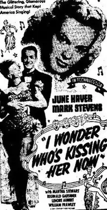 I Wonder Who's Kissing Her Now (1947) is a musical film in Technicolor, directed by Lloyd Bacon, and starring June Haver and Mark Stevens. I Wonder Who's Kissing Her Now is a biographical film about Joseph E. Howard, the "writer" of the popular song of the same title.[3]