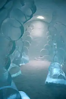 After its first opening in 1990, the hotel has been rebuilt each year from December to April.[2] The hotel, including the chairs and beds, is constructed from snow and ice blocks taken from the nearby Torne River. Artists are invited to create different rooms and decorations made of ice. Besides bedrooms, there is a bar, with glasses made of ice and an ice chapel that is popular with marrying couples. The structure remains below freezing, around −5 °C (23 °F).[1]
