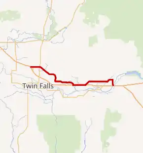 SH-25 continues east into the town of Paul where it intersects SH-27. After passing the Rupert Country Club, it comes to a T intersection with SH-24 and turns northeast, running concurrently with SH-24 through the city of Rupert, where SH-25 continues east as Baseline Road. The highway makes a sharp turn south, crossing the Snake River before terminating at I-84.[2]