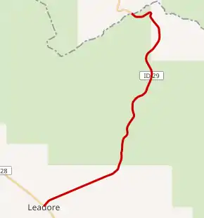 SH-29 begins at an intersection with SH-28 in the town of Leadore. The highway continues northeast as Railroad Canyon Road before turning north and entering the forest. The road curves through the mountains until it reaches the Montana state line at Bannock Pass, where it becomes Montana Secondary Highway 324.[2][1]