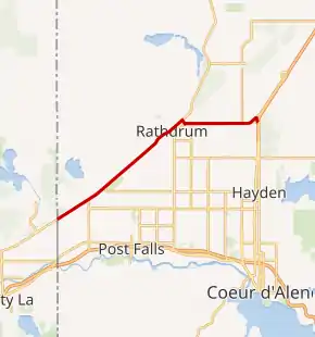 SH-53 begins at the Washington state border southwest of Hauser at the eastern terminus of Washington State Route 290, which serves Spokane, Washington. Trent Road travels northeast, paralleling the Burlington Northern Santa Fe railroad through farmland and several small suburban communities towards Rathdrum. The highway serves the northern area of the city, passing strip malls and businesses, to an intersection with SH-41. At the intersection, SH-53 turns southeast and begins a short concurrency with SH-41 to cross the railroad via an overpass. The highway splits from SH-41 near Lakeland High School and travels due east through a commercial district.[3] From the commercial district, the roadway travels towards farmland and sharply turns north before cutting back southeast over a UPRR railroad line. After the overpass, SH-53 ends at a signalized intersection with US-95 north of Hayden.[4] The Idaho Transportation Department has plans to straighten the east end of the highway and replace the signalized intersection with an interchange by the end of 2020.[5]