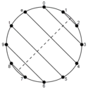 - "C-E, D-F♯, E♭-G, are different instances of the same interval [interval-4]...[an] other kind of identity...has to do with axes of symmetry [reflection symmetry rather than interval families' rotational symmetry]. C-E belongs to a family [sum-4] of symmetrically related dyads as follows:"