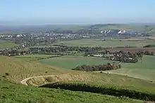 The Downs to the west of Iford are impressive. It is the most treeless part of our Downs without the deep-cut bostals (tracks) visible in other parts, as medieval traders and herders descended these slopes comparatively rarely. At the top of the scarp in this area are three hills: Front Hill, Iford Hill and Swanborough Hill. Across the ridge is the line of the South Downs Way.Unfortunately despite passing close to the designated Iford Hill slopes, it does not actually pass ancient Downland pasture, nor benefit from the flowers and wildlife that survives off it. Three ancient barrow clusters have also been lost to the plough on Front Hill.[9]