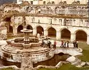 The Mercedarians were the first to establish a male monastery at the former Santiago de Guatemala.[1] The cross in stone at the atrium and the rooms behind the main altar are the oldest structures in La Merced and date from the seventeenth century. In 1749 Juan de Dios Estrada was commissioned with the construction of the luxurious sanctuary and cloister. He erected a building of low height designed to withstand earthquakes based on the experiences of the tremor of 1751. Arches and columns are wider to cope with the quakes. It was opened in 1767.
