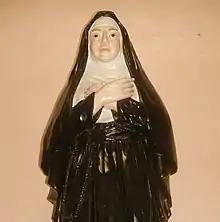| Attributes | Arms crossed in prayer with a rosary, needles, scissors, almsbaskets, dove, Betania retreat house |
