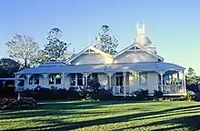 The house is a timber-framed building clad with horizontal timber weatherboards. The corrugated iron roof of the building, which incorporates an attic, is quite complex, reflecting the complexity of the internal planning. The roof scape comprises a number of asymmetrically arranged and variously sized gabled and hipped sections, with a steeply pitched mansard roof over the attic, which is surmounted with a decorative cast iron balustrade, with projecting finials from the corners. Surmounting the gabled ends are similar cast iron finials. The house is lined on three sides by bull-nosed verandahs although some of these have been infilled.[1]