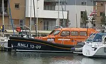 The first motor lifeboat at Ilfracombe was placed on station in March 1936. This was a 32 feet (9.8 m) Surf lifeboat, a type that was designed for work close inshore. It was replaced by a more conventional 35 feet (11 m) Liverpool-class boat in 1945, which allowed the Surf boat to be sent to the Netherlands where there was an acute shortage of lifeboats at the end of World War II.[1] The all-weather boat has been supported by an inflatable inshore rescue boat since 1991.[3]