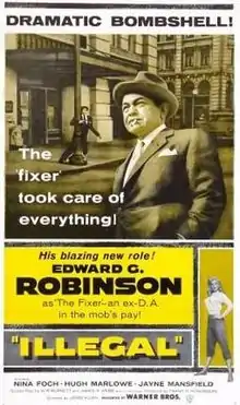 Illegal is a 1955 American film noir directed by Lewis Allen. It stars Edward G. Robinson, Nina Foch, Hugh Marlowe and Jayne Mansfield.[1] It is the third film adaptation of the 1929 play "The Mouthpiece" by Frank J. Collins, following The Mouthpiece and The Man Who Talked Too Much.