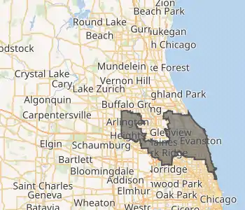The 9th congressional district of Illinois covers parts of Cook County, as of the 2011 redistricting which followed the 2010 census. All or parts of Chicago, Des Plaines, Evanston, Glenview, Lincolnwood, Morton Grove, Mount Prospect, Niles, Park Ridge, Prospect Heights, Skokie, Wilmette, Winnetka, and Arlington Heights are included.[4] It is anchored in Chicago's North Side, along Lake Michigan, and covers many of Chicago's northern suburbs. Democrat Jan Schakowsky has represented the district since January 1999.