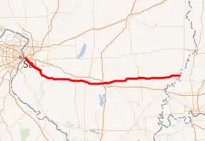 Illinois Route 15 (IL 15) is a 149.64-mile-long (240.82 km) east–west highway in southern Illinois with its western terminus at Illinois Route 3, U.S. Route 40, I-55, and I-64, and its eastern terminus at Wabash River at the Illinois/Indiana Border where it meets State Road 64.[1]