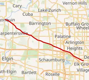 IL 62 is called Algonquin Road for its entire length, and it is a northern parallel to Interstate 90 (I-90). It is one of the few state roads in Illinois to be shorter than the name of the road that it marks, as Algonquin Road continues westward as McHenry CR A48 to IL 47 (about eight miles [13 km]), eastward as a local road to Oakton Street and Riverside Drive by I-294 (about five miles [8.0 km]), and northward as a local road to U.S. Route 14 (US 14, about five miles [8.0 km]) in Fox River Grove. The eastward extent of Algonquin Road is mainly residential, however. It is a four lane street through downtown Algonquin and then shifts to a two lane rural road east of IL 25. It returns to a four lane urban artery east of IL 59.