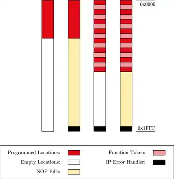 With NOP-Fills, the reliability of a system in case of a disturbed instruction pointer can be improved in some cases. The entire program memory that is not used by the program code is filled with No-Operation (NOP) instructions. In machine code a NOP instruction is often represented by 0x00 (for example, Intel 8051, ATmega16, etc.). The system is kept in a defined state. At the end of the physical program memory, an instruction pointer error handling (IPEH IP-Error-Handler) has to be implemented. In some cases this can be a simple reset.