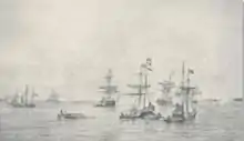 British naval officer Lord Thomas Alexander Cochrane was made the commander of the Imperial Navy and received the rank of "First Admiral".[9][10] At that time, the fleet was composed of one ship of the line, four frigates, and smaller ships for a total of 38 warships. The Secretary of Treasury Martim Francisco Ribeiro de Andrada created a national subscription to generate capital in order to increase the size of the fleet. Contributions were sent from all over Brazil. Even the Emperor Pedro I acquired a merchant brig at his own expense (that was renamed "Caboclo") and donated it to the State.[10][11] The navy fought in the north and also south of Brazil where it had a decisive role in the independence of the country.[12]