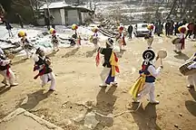 In Pilbong village,「Madang-Balbgi(마당 밟기)」is performed on the first day of the year (eong-cho),Ma-gut[13](매굿)」which is performed on the last day of the year (Sugdal-gumum), 「Dang san-je[14](당삱c is played for nine days on Jeong-wol, 「Nodi-gosa gut(노디고사굿)」. It is performed on the fifth day of Borum「Gulgung-gut(걸궁굿)」, which is performed when visiting other villages for money or grain, 「Durae-gut(두레굿)」 for summer farming, etc.[15]