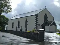 Before the present church of Inagh was built there was a long, low "mass house" in the townland of Knockahaurin. The floor was used for threshing during the harvest. The present church was built in 1858.[6] Stones from the old mass house and slates from the Killaloe quarries were used for the walls, and the roof was thatched. The church was dedicated in 1869 by Bishop Power. The high altar was installed in 1895 and the Stations of the Cross in 1905. The stained glass window behind the altar dates to 1910.[5] The church was renovated in 1932, with a new roof, floor and altar rails, and the holy water font taken from the ruins of the old chapel.[5]