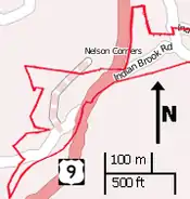 The district consists of two irregularly shaped areas along unpaved Indian Brook Road joined by a narrow corridor along the brief, paved section of Route 9 that connects them. These boundaries reflect the extent of Nelson's Corner during its peak period of growth in the late 19th century. They include all of ten separate lots.[1]