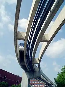 There are two separate parallel elevated guideways side-by-side, both of which operate in both directions. The concrete rails have a gap between them, designed to combat winter snow and the people mover is therefore not technically a monorail.[5]