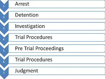 Prosecutors are involved in the whole trial process, from the investigations, to trial proceedings and the execution of punishment. At the investigation stage, the prosecutor supervises the police's investigations. The prosecutor only personally investigates cases when there are special crimes, such as corruption.[34] Once the police complete investigations, they hand the evidence to the prosecutor.[11] If the evidence is satisfactory,[35] the prosecutor will prosecute the offender at an appropriate court.[36] He will prepare a Bill of Indictment for the judge[37] to begin the trial proceedings.