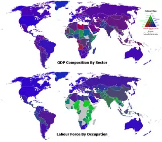 The relationships among economic growth, employment, and poverty reduction are complex. Higher productivity, it is argued, may lead to lower employment (see jobless recovery).[17] There are differences across sectors, whereby manufacturing is less able than the tertiary sector to accommodate both increased productivity and employment opportunities; more than 40% of the world's employees are "working poor", whose incomes fail to keep themselves and their families above the $2-a-day poverty line.[17] There is also a phenomenon of deindustrialisation, as in the former USSR countries' transition to market economies, and the agriculture sector is often the key sector in absorbing the resultant unemployment.[17]