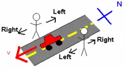 For a simple example involving only the orientation of two observers, consider two people standing, facing each other on either side of a north-south street. See Figure 2. A car drives past them heading south. For the person facing east, the car was moving towards the right. However, for the person facing west, the car was moving toward the left. This discrepancy is because the two people used two different frames of reference from which to investigate this system.