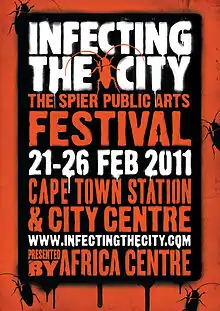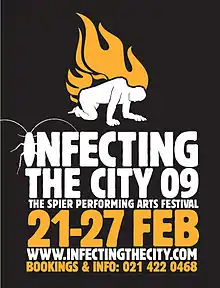 The festival started as Infecting The City Performing Arts Festival in 2008 with a "singular aggressive aim – to infect the city with performance that captures the complexities of our daily lives".[4] The Festival was born to migrate some of the experiences of the now-disbanded Spier Summer Season on the Spier Wine Farm to the central part of Cape Town. The annual Spier Summer Season first started in 1996 and included diverse performances such as opera, comedy, poetry and music over a three-month period each year. In 2007, the Spier Arts Trust, the organisation which produced the Summer Season, discontinued the project. The Africa Centre, with funding from Spier, decided to continue the spirit of the Summer Season by creating a week-long performance art festival in the centre of Cape Town. Brett Bailey has curated the 2009, 2010 and 2011 iterations of the Infecting The City Festival.Jay Pather curated the festival in 2012
