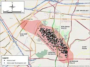The Inglewood Oil Field underlies the Baldwin Hills, a range of low hills near the northern end of the Newport–Inglewood Fault Zone. The hills are cut by numerous canyons, and include a central depression along the east side of which is a scarp representing the surface trace of the Newport–Inglewood Fault. The hills terminate abruptly on the north, east, and west, and slope gradually down to the south. Surface drainage from the hills is generally south and west, with runoff from the oil field going into six retention basins which drain into the Los Angeles County storm drainage network, and then into either Centinela Creek or Ballona Creek.[5]