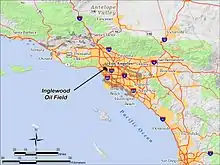 The Inglewood Oil Field in Los Angeles County, California, is the 18th-largest oil field in the state and the second-most productive in the Los Angeles Basin. Discovered in 1924 and in continuous production ever since, in 2012 it produced approximately 2.8 million barrels of oil from some five hundred wells. Since 1924 it has produced almost 400 million barrels, and the California Department of Oil, Gas and Geothermal Resources (DOGGR) has estimated that there are about 30 million barrels remaining in the field's one thousand acres, recoverable with present technology.[1]