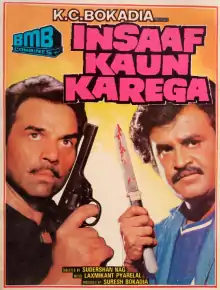 Insaaf Kaun Karega (transl. Who will deliver justice?) is a 1984 Indian action film directed by Sudarsan Nag and written by K. C. Bokadia. It stars Dharmendra, Rajinikanth, Jaya Prada and Madhavi.