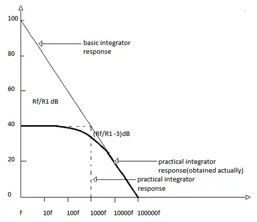 The gain of an integrator at low frequency can be limited to avoid the saturation problem, therefore to avoid saturation of the op amp the feedback capacitor is shunted by a resistor Rf. The parallel combination of Rf and C behaves like a practical capacitor which dissipates power, unlike an ideal capacitor. For this reason this circuit is also called a lossy integrator. The resistor Rf limits the low frequency gain to (-Rf/R), generally [Rf=10*R1] and thus provides DC stabilisation.