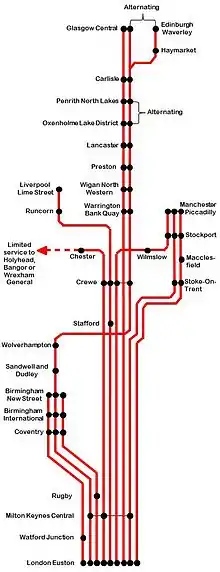 | E | London Euston – Manchester Piccadilly | Milton Keynes Central (1tph), (Stoke-on-Trent, Macclesfield (1tph) / Crewe, Wilmslow), Stockport 2tph run via Stoke-on-Trent and 1tph runs via Crewe. Trains via Stoke-on-Trent call alternately at Milton Keynes Central and Macclesfield. Off-peak trains via Crewe do not call at Milton Keynes Central. | Pendolino | 3tph |
